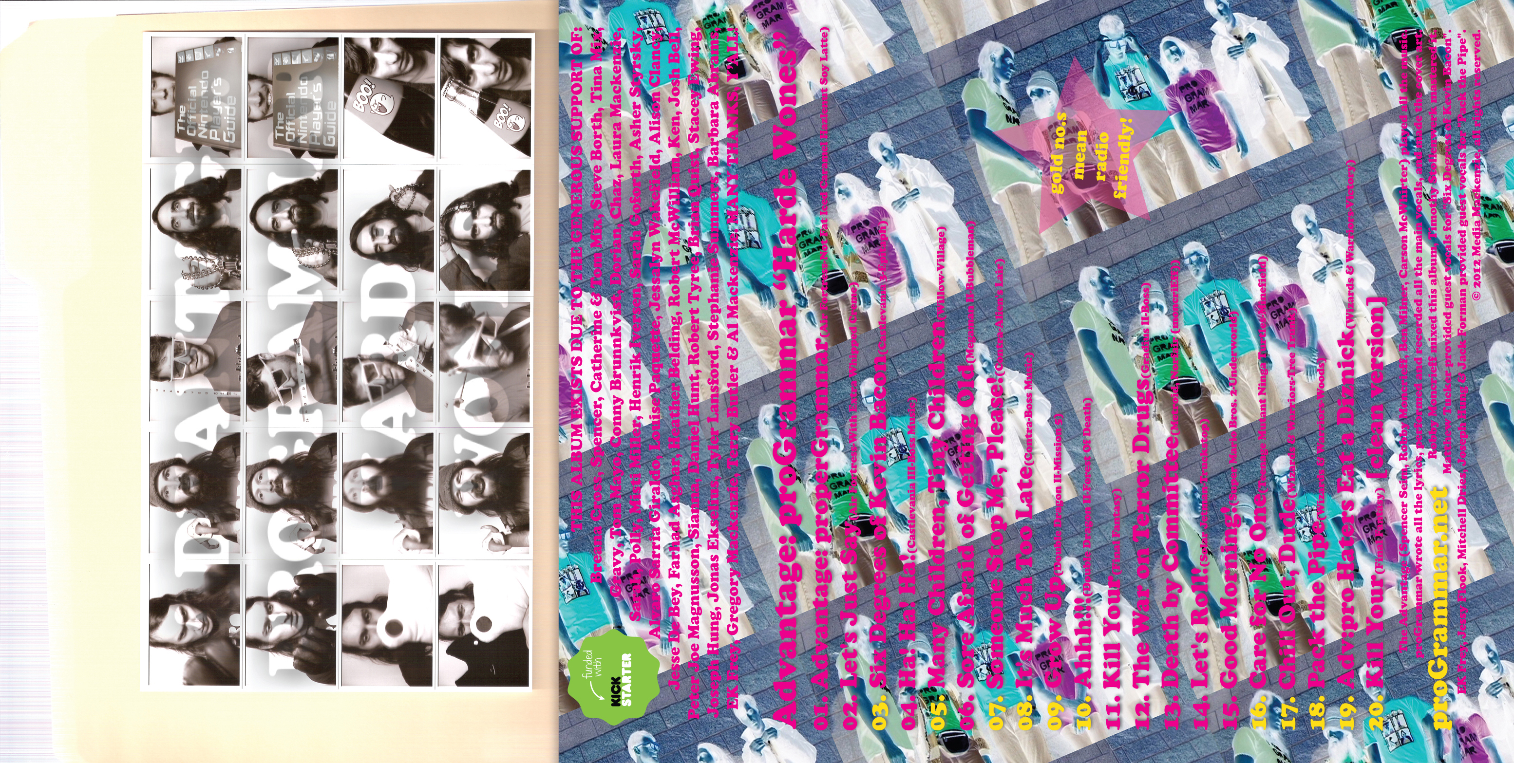 The Advantage (Spencer Seim, Robby Moncrieff, Ben Milner, Carson McWhirter) played all the music. proGrammar wrote all the lyrics, performed and recorded all the vocals, and made the cover art. Robby Moncrieff mixed the album. Timothy Stollenwerk mastered it. Matthew Tucker provided guest vocals for "Six Degress of Kevin Bacon". Emily Kendal Frey, Jessy Flook, Mitchell Dries, Joseph Hung and Jack Forman provided guest vocals for "Pack the Pipe". |