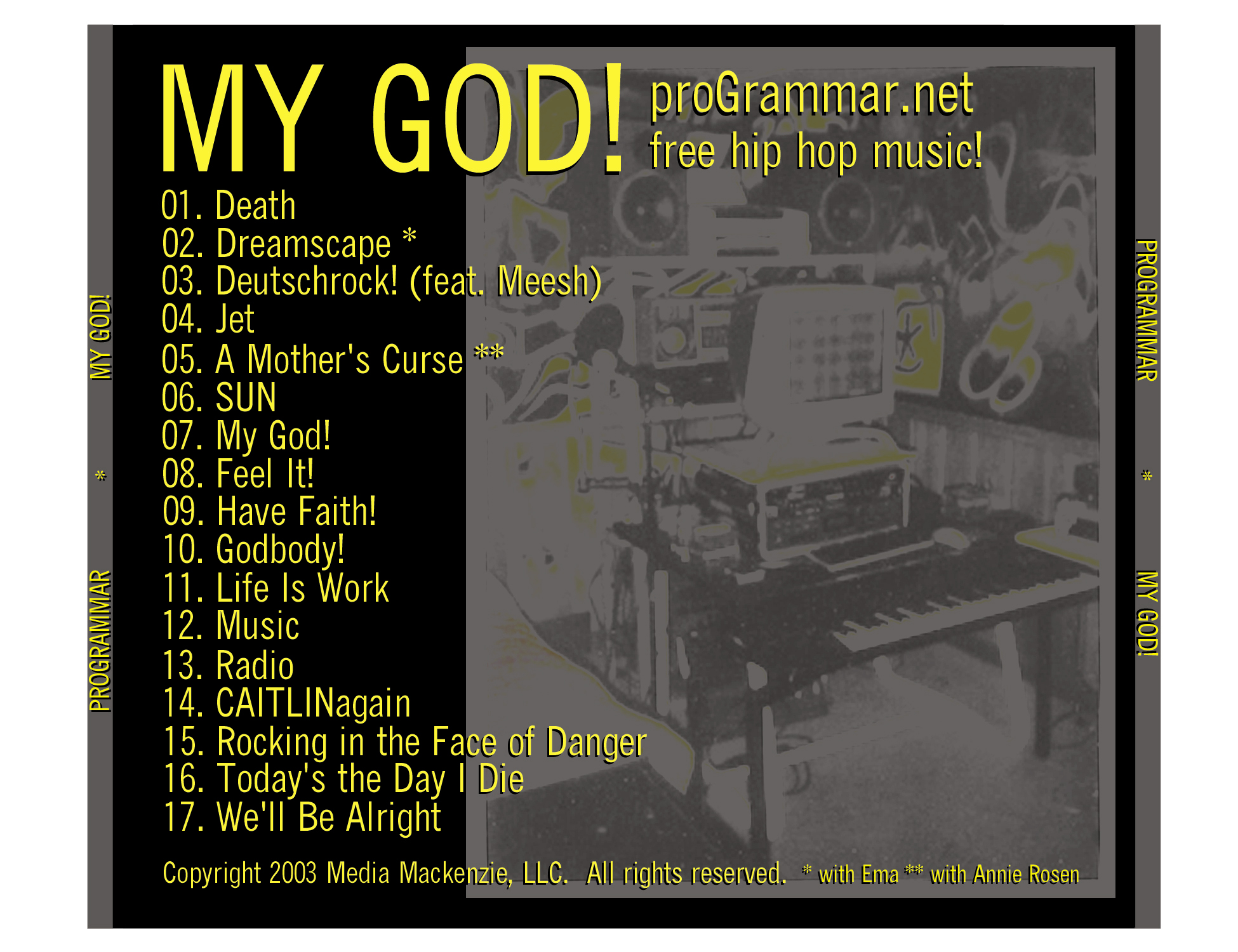 All beats created by me. All lyrics written by me (except for "Deutschrock!" which Meesh did.) All rapping recorded by me. All sound effects sequenced by me. All skratches by me. Artwork by me. Or, all done through me by My God, I should say.