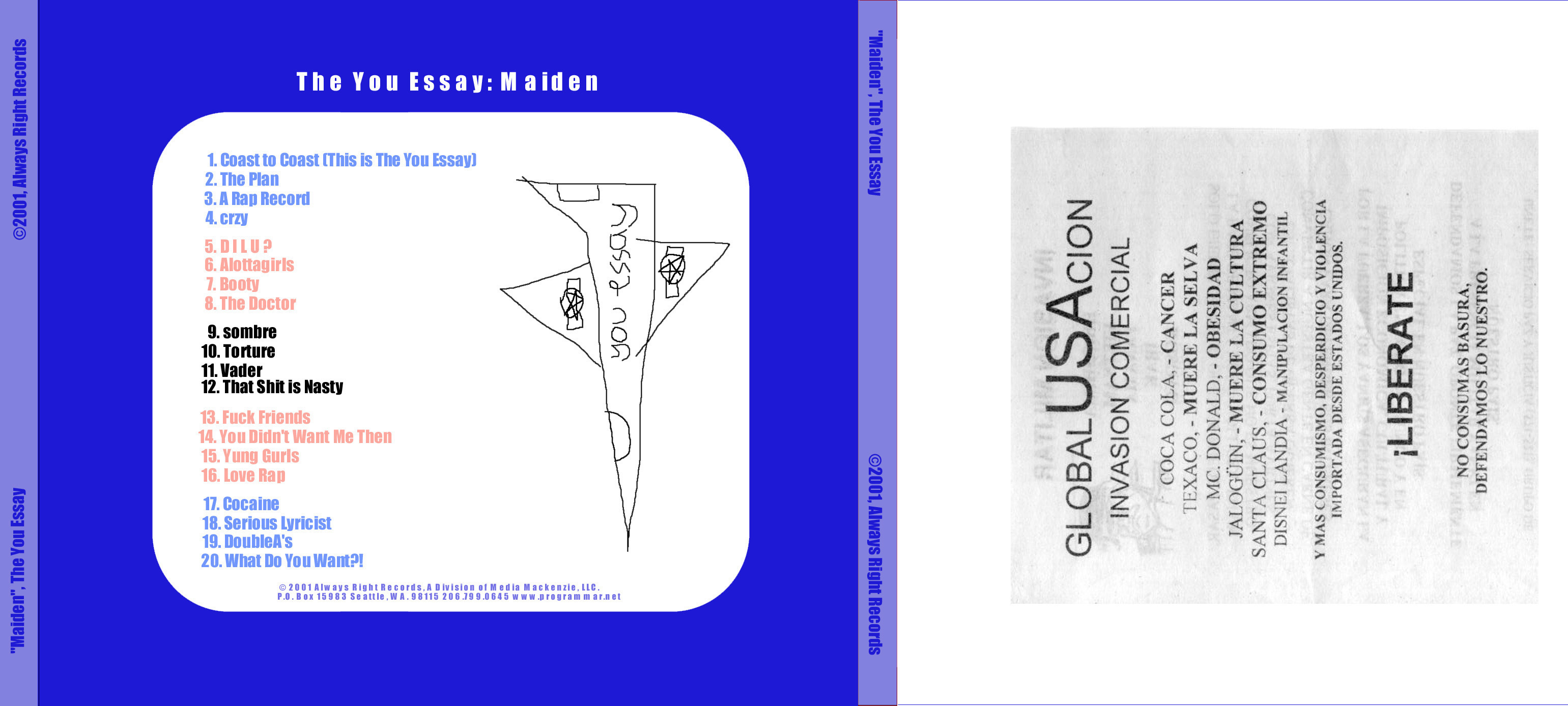 The You Essay was supposed to be a vehicle for my crew to rock on (my crew at the time was supposed to have been Meesh, Uncle Mic, Eso, and some extended members of Oldominion: Bishop, Gash, Freeze, Bits and some other Seattle cats maybe Native maybe Specs maybe Beans) but the problem was, none of these people beyond the first three was a very good friend of mine at all and we certainly weren't really in a crew. So, I didn't personally have enough lyrical ideas / raps for a whole album, nor did I have the friends to fill in the blanks. So what you end up hearing is a bunch of production ideas with sparse lyrical content.